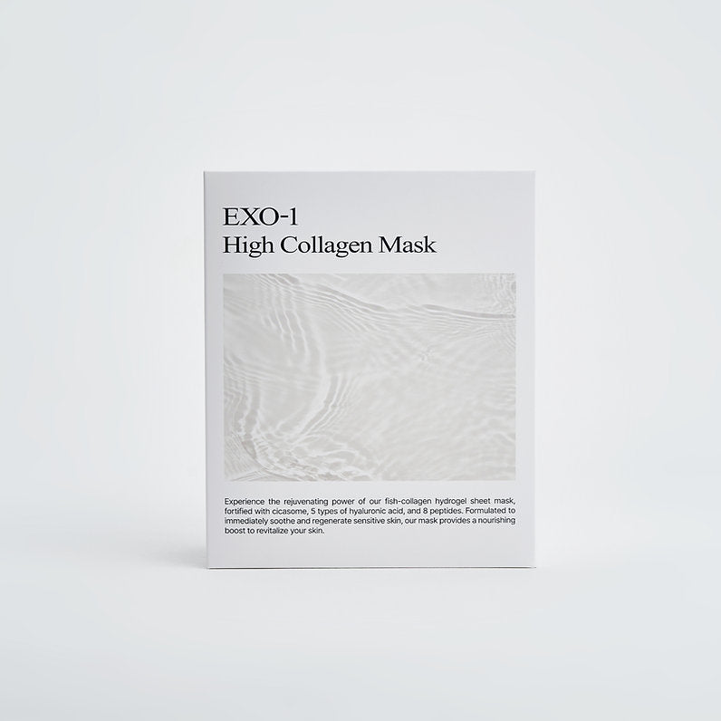The EXO-1 High Collagen Mask is a premium 3-layer sheet mask designed to provide intensive hydration and firming care for both the face and neck. With its high concentration of low-molecular-weight collagen (250 Da) and soothing botanical ingredients, this mask delivers visible results in a single use — calming, tightening, and revitalizing sensitive or tired skin.